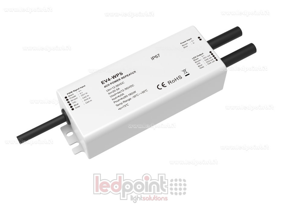 SISTEMAS SKYDANCE CATÁLOGO FAQ Amplificador de señal estanco IP67 voltaje constante, 12-36V con 4 canales de 5A. Compatible con tiras led de voltaje constante RGBW. Instalable en serie o en paralelo, permite transmitir la señal sin limites.