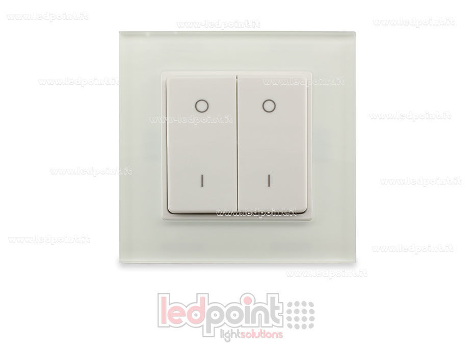 Mando a distancia RF de pared para controlador monocromático, dos zonas controlables. Cada mando a distancia se puede asociar a uno o más controladores. Alimentado por batería CR2032. Muy fácil de instalar sobre todo en caja de conexiones para pared.