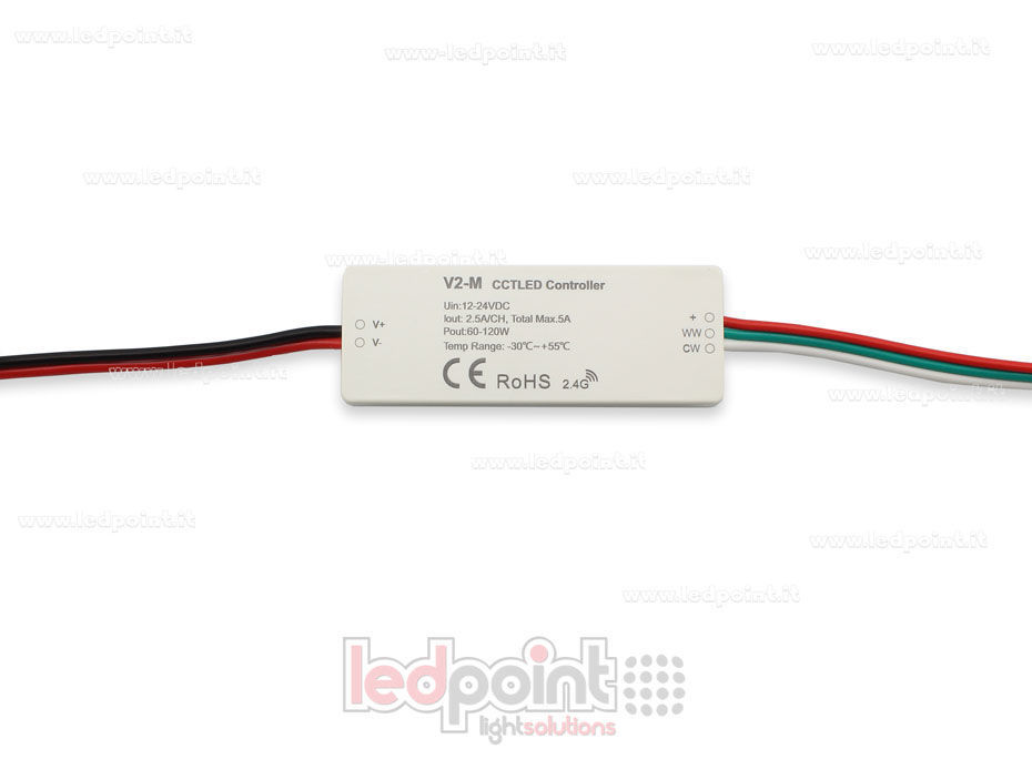 SISTEMAS SKYDANCE CATÁLOGO FAQ Mini dimmer receptor CCT 12-24V, 2ch 2.5A/CH, RF 2.4GHz. Mini controlador RF CCT voltaje constante 2 canales. Salida 2,5A por canal para tiras led CCT. Se puede asociar a todo mando a distancia RF monozona o multizonas CCT hasta un número máximo de 10 mandos a distancia.